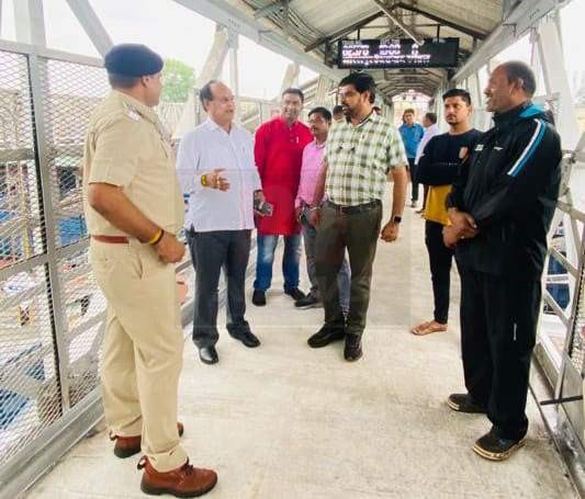 पादचारी पुलाचे निरीक्षण करताना रेल्वेचे अधिकारी