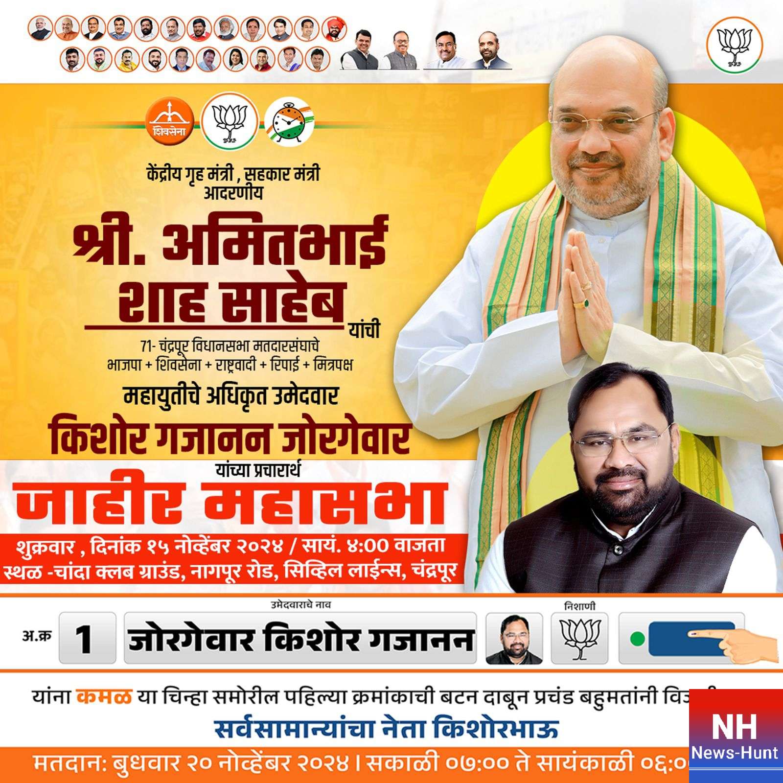 महायुतीचे अधिकृत उमेदवार आमदार किशोर जोरगेवार यांच्या प्रचारासाठी भाजपचे स्टार प्रचारक चंद्रपूरात येत असून, उपमुख्यमंत्री देवेंद्र फडणवीस आणि केंद्रीय मंत्री नितीन गडकरी यांची चंद्रपूर आणि घुग्घुस येथे भव्य सभा पार पडली आहे. तर आता केंद्रीय गृहमंत्री अमित शाह यांच्या भव्य सभेचे आयोजन करण्यात आले आहे. संध्याकाळी 4 वाजता सदर सभा आयोजित करण्यात आली असून, चांदा क्लब मैदानात ही सभा पार पडणार आहे. या सभेची जय्यत तयारी भारतीय जनता पक्षाच्या वतीने करण्यात आली आहे. सभेला महायुतीचे वरिष्ठ पदाधिकारी, कार्यकर्ते आणि चंद्रपूरकरांनी मोठ्या संख्येने उपस्थित राहावे, असे आवाहन भारतीय जनता पक्षाच्या वतीने करण्यात आले आहे.