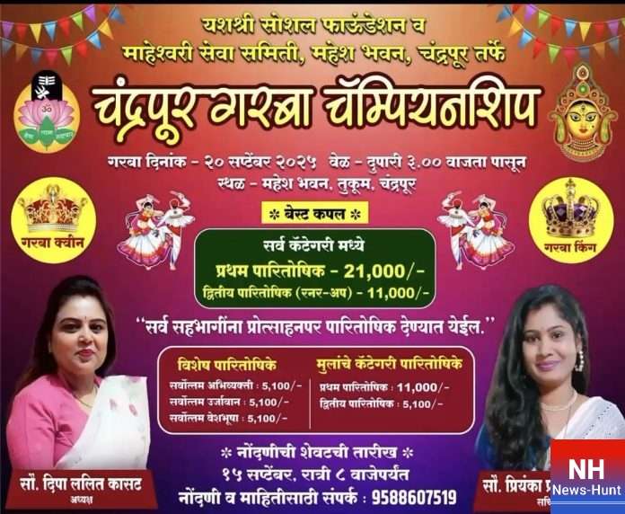 इसी क्रम में 20 सितंबर को महेश्वरी भवन, चंद्रपुर में एक दिवसीय गरबा महोत्सव आयोजित किया जाएगा। इस महोत्सव के माध्यम से युवा वर्ग को नृत्य, संगीत और पारंपरिक खेलों का आनंद लेने का अवसर मिलेगा, जिससे पूरे शहर में उत्साह और आनंद का वातावरण बन गया है विशेष आकर्षण के रूप में इस महोत्सव में ‘गरबा क्वीन’ और ‘गरबा किंग’ प्रतियोगिता का आयोजन होगा, जिसमें विजेताओं को आकर्षक पुरस्कार दिए जाएंगे।