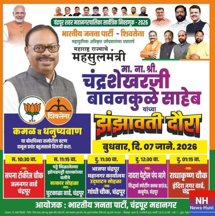 भारतीय जनता पार्टीच्या उमेदवारांच्या प्रचारार्थ उद्या बुधवारला ना. चंद्रशेखर बावनकुळे यांच्या चंद्रपूरात तीन सभा